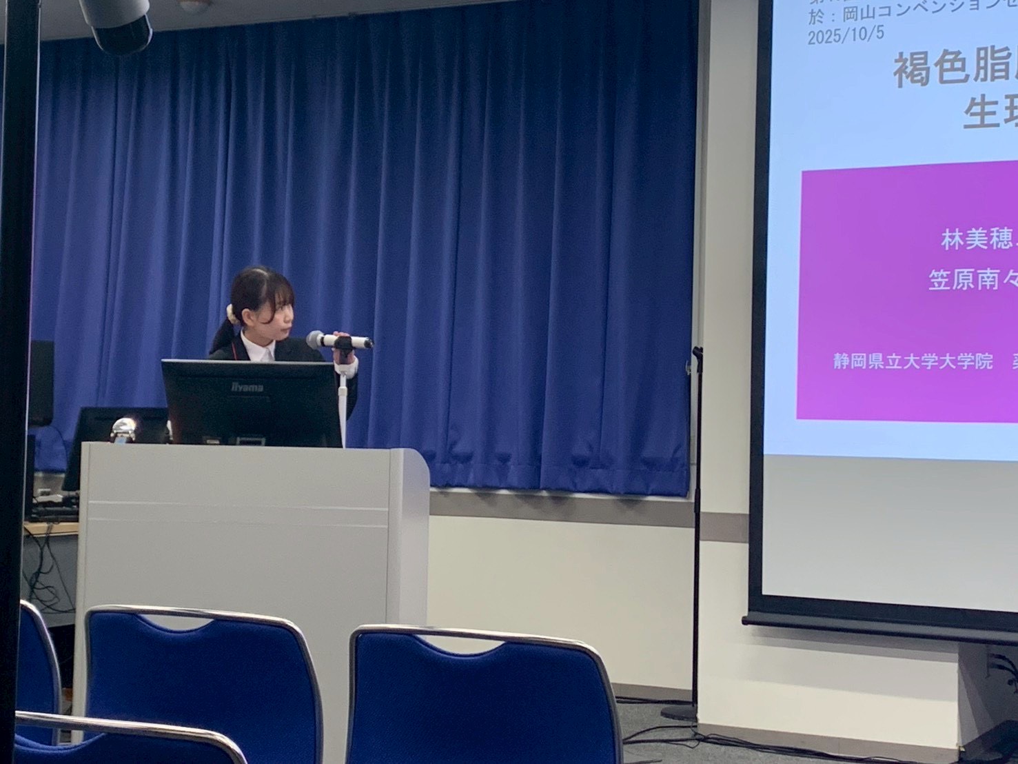 2025年10月6日 更新情報 第46回日本肥満学会学術集会 10月4-5日に開催された第46回日本肥満学会学術集会(岡山)で、大学院生が発表しました。 林美穂「褐色脂肪組織におけるPDK1-mTOR経路の生理的意義とメカニズムの解明」